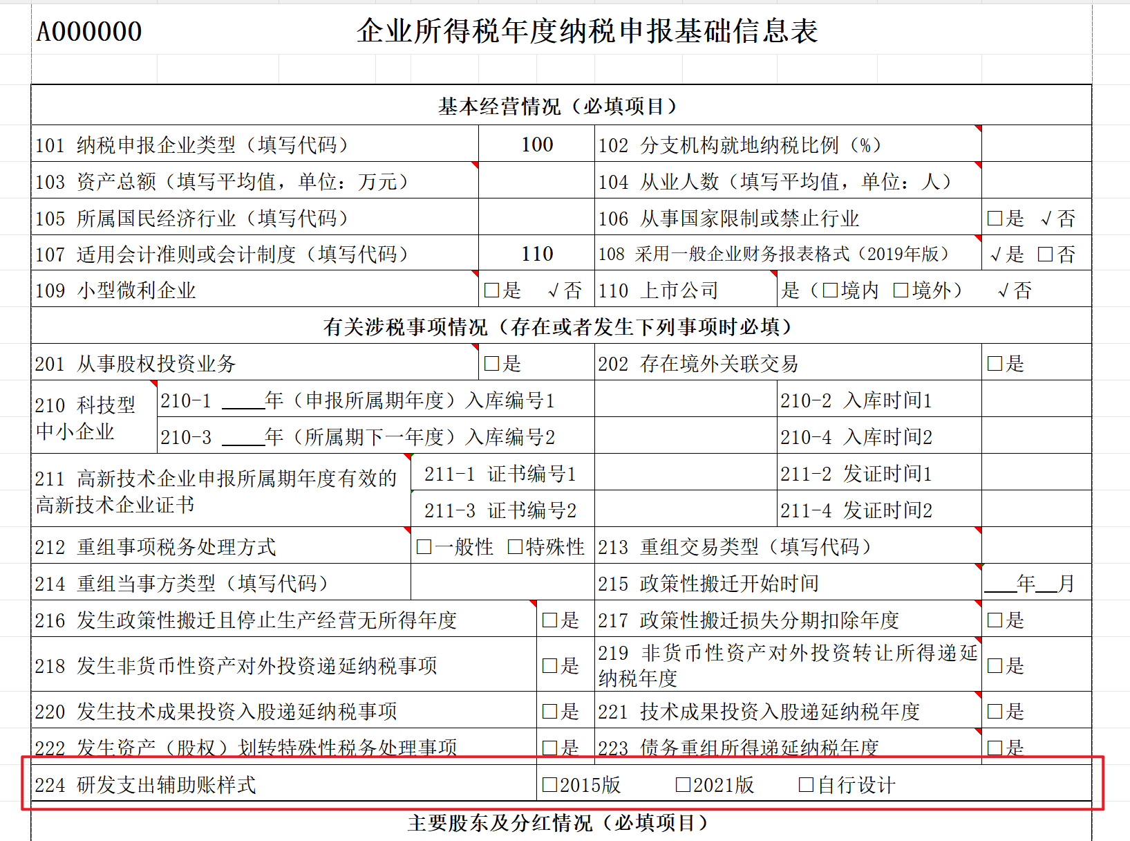 在第224行,选择研发支出辅助账样式:选2015版需沿用原体系、费用化与资本化分别设账,A107012表相应行次需填报明细并执行表内计算;选2021版(推荐)则简并样式、资本化与费用化在同一账簿反映,A107012表直接填合计数、无需填报明细;选自行设计需包含2021版全部数据项且逻辑关系一致,填报要求同2021版。