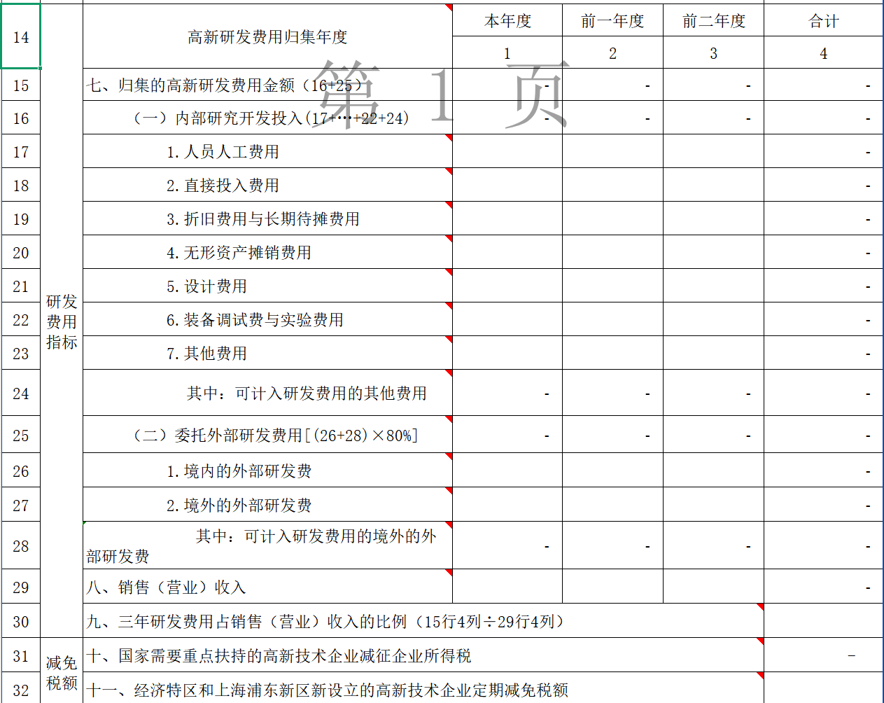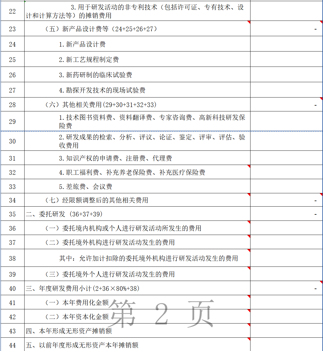 对于资本化的研发支出,在无形资产形成年度,第2行至第39行应包含当年度及以前年度为该项无形资产的所有研发支出;尚未形成无形资产的年度和形成无形资产之后的年度,第2行至第39行不包含该项无形资产的研发支出。