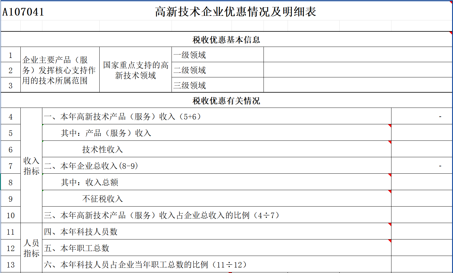 Ø A107041 高新技术企业优惠情况及明细表——高新技术企业填报优惠情况。