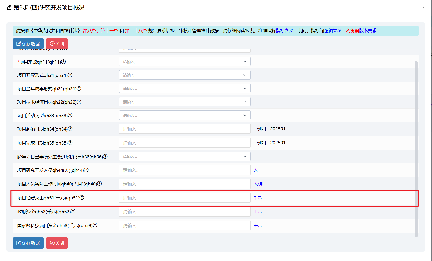 每个研发项目应单独填报一行,包括项目名称、项目来源、项目开展形式、项目技术经济目标、项目起始日期、项目完成日期、跨年项目当年所处主要进展阶段、项目经费支出、项目人员等相关信息。